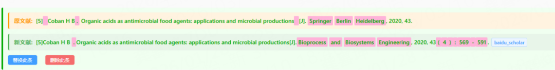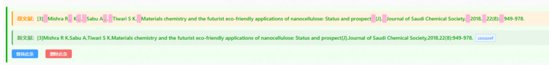 ↑查找到正确文献后,使用者可跳转文献源进行核查,确认修改后的文献无误,则可以进行一键替换,极大提高编校效率,省时更省力。