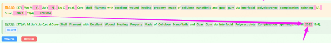 ↑原文献引用格式中,每个标点符号后面都加了空格,实际上应该删除空格,被【文献校对系统】成功识别并标注。(如需核验真伪,可点击“crossref”进行核实)